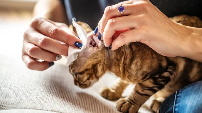 Use a soft cloth or cotton ball to wipe away any discharge or debris.